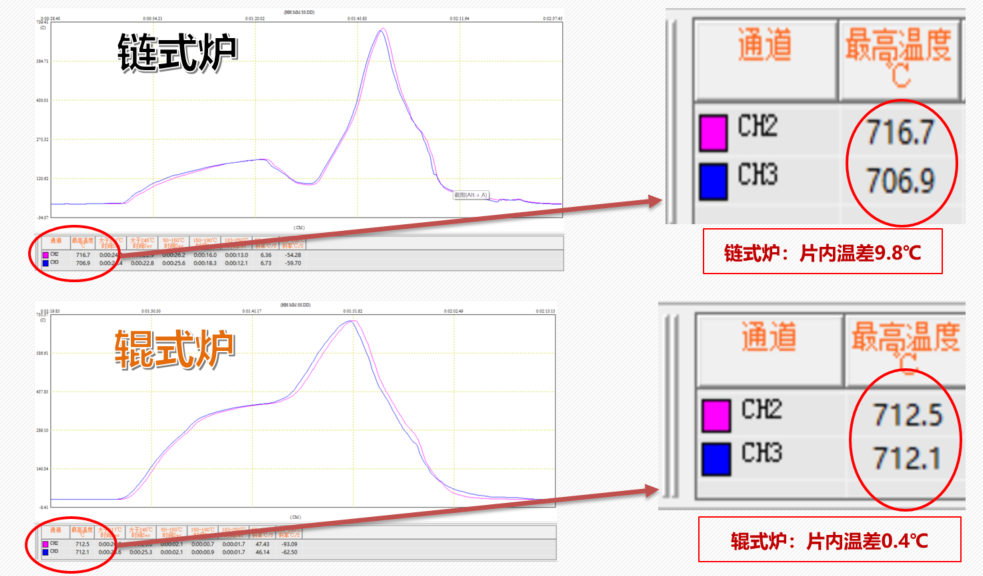 此外數字化信息化技術的應用,使傳輸精度大幅提高,并實現精準掌控。一方面,實現實時各產線運行狀況監控。另一方面,通過自動化調節,使電池片整個燒制過程溫差控制在0.4℃,確保太陽能電池成品沒有EL云片和黑斑,電池的不良比率幾乎為0(金屬網帶鏈式燒結爐片內溫差為9.8℃,EL云片和黑斑不良率約3%)。