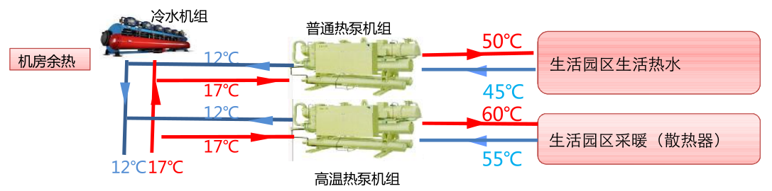 機(jī)房余熱回收技術(shù)應(yīng)用。項(xiàng)目配套建設(shè)了集中余熱回收系統(tǒng),規(guī)劃為整個(gè)園區(qū)辦公區(qū)域提供冬季采暖熱源,全部采暖熱源由機(jī)房設(shè)備產(chǎn)生余熱供給。通過采用水源熱泵機(jī)組,與空調(diào)系統(tǒng)的冷凍水回水進(jìn)行熱交換,為園區(qū)輔助用房提供采暖和生活熱水,充分利用系統(tǒng)余熱,提高能源綜合利用率。僅一期余熱回收系統(tǒng)就實(shí)現(xiàn)了辦公區(qū)域總建筑面積44336.12㎡的供暖,節(jié)省了巨額的冬季采暖費(fèi)用,等效節(jié)約電量321萬度。哈爾濱數(shù)據(jù)中心也在探索與供暖商合作模式,余熱回收在滿足園區(qū)內(nèi)需求基礎(chǔ)上,進(jìn)一步擴(kuò)大應(yīng)用范圍,為全社會(huì)碳減排做出貢獻(xiàn)。