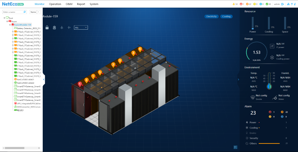 采用3D模擬仿真技術(shù),實(shí)現(xiàn)資源圖形化和可視化,對(duì)機(jī)房、機(jī)架、設(shè)備上下架等進(jìn)行3D模擬仿真,保證界面與數(shù)據(jù)庫信息的一致。實(shí)現(xiàn)對(duì)機(jī)房容量、負(fù)荷能力的形象化、精細(xì)化展現(xiàn)。點(diǎn)擊架構(gòu)中的設(shè)備可跳轉(zhuǎn)至設(shè)備的具體位置。通過CFD仿真及溫度云圖展示,指導(dǎo)優(yōu)化機(jī)房氣流組織,確保運(yùn)行安全并提升機(jī)房溫度,可有效地達(dá)到節(jié)能效果,降低機(jī)房制冷能耗。