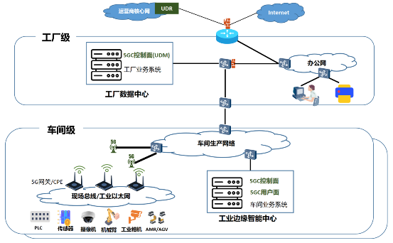 在工廠數據中心部署5G核心網控制面網元UDM,企業層及管理層業務軟件(例如,ERP及MES等),通過邊界交換機和車間生產網絡及企業辦公網實現互通。辦公網通過網關路由器接入互聯網。在網關路由器及各個邊界交換機上配置防火墻,防止非法訪問和惡意攻擊。