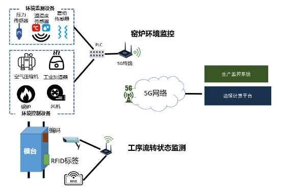 在模臺的邊側布置RFID電子標簽,在每個工位布置RFID標簽讀寫器。RFID標簽讀寫器通過5G終端設備接入5G網絡。當模臺流轉到相應工位時,RFID標簽讀寫器讀取到標簽ID,通過5G網絡上報給上位機,進而通知給MES,使得MES掌握特定產品在生產流程中的位置。RFID標簽讀寫器每次產生的數據為64字節。