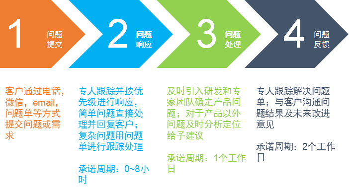 支持多種形式的渠道(電話、微信、郵件和售后技術服務工單系統)接收故障申報,根據問題性質及等級提供不同程度的響應。