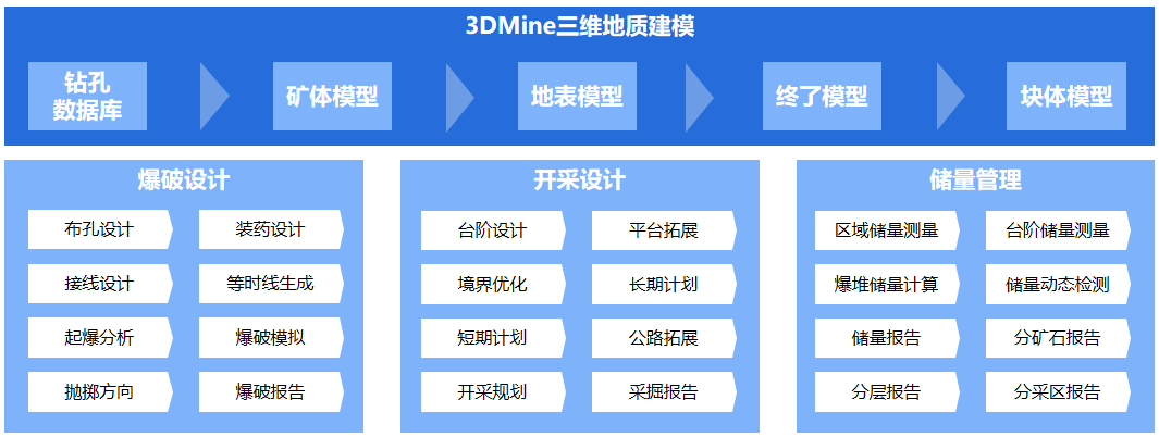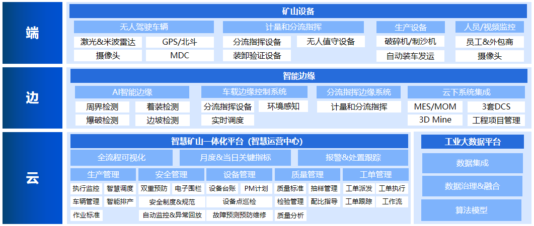 根據露天非金屬礦山企業的實際生產需求,結合行業痛點,通過對礦山穿、爆、裝、運、卸等各個生產環節長期跟蹤調研,全流程收集分析生產數據,采用信息化、數字化、智能化手段,對礦山資源開采、生產計劃、爆破流程、車鏟調度、品位搭配、裝卸計量、安全管理等各個生產環節進行流程優化與管控,解決傳統礦山數字化程度低、生產數據遺失、業務環節分散不互通的難題,實現礦山資源開采的數字化、安全生產的智能化以及智能管控的集成化。